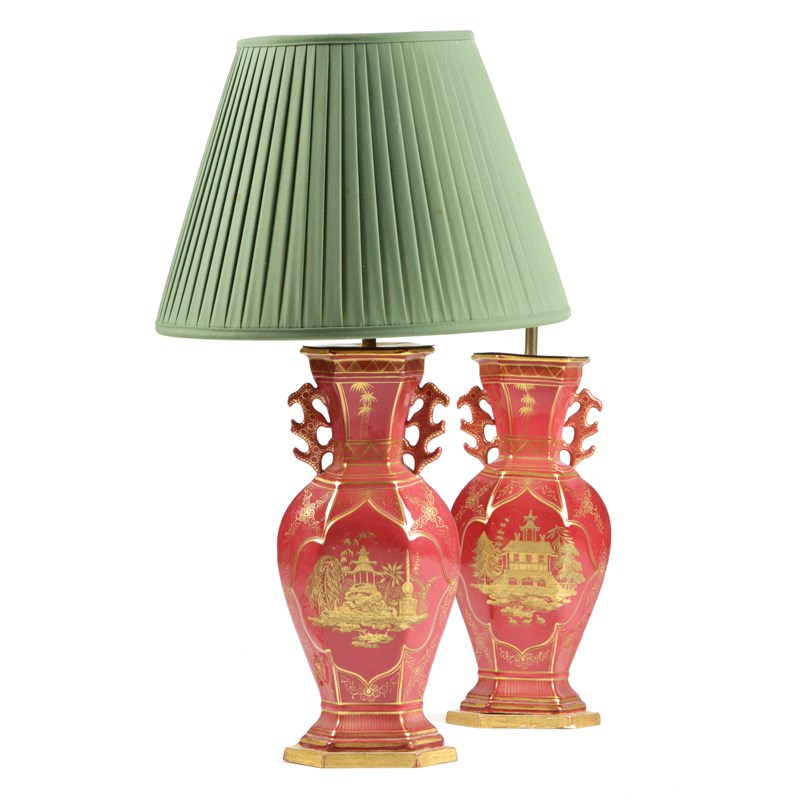 each decorated in gilt on a a maroon ground with pagodas and oriental style buildings, on a giltwood foot, fitted for electricity (2)