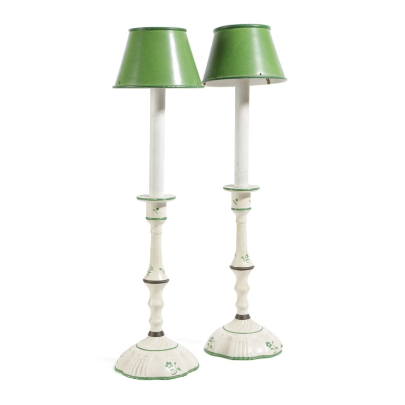 A PAIR OF PAINTED WOOD AND COMPOSITION CANDLESTICK TABLE LAMPS