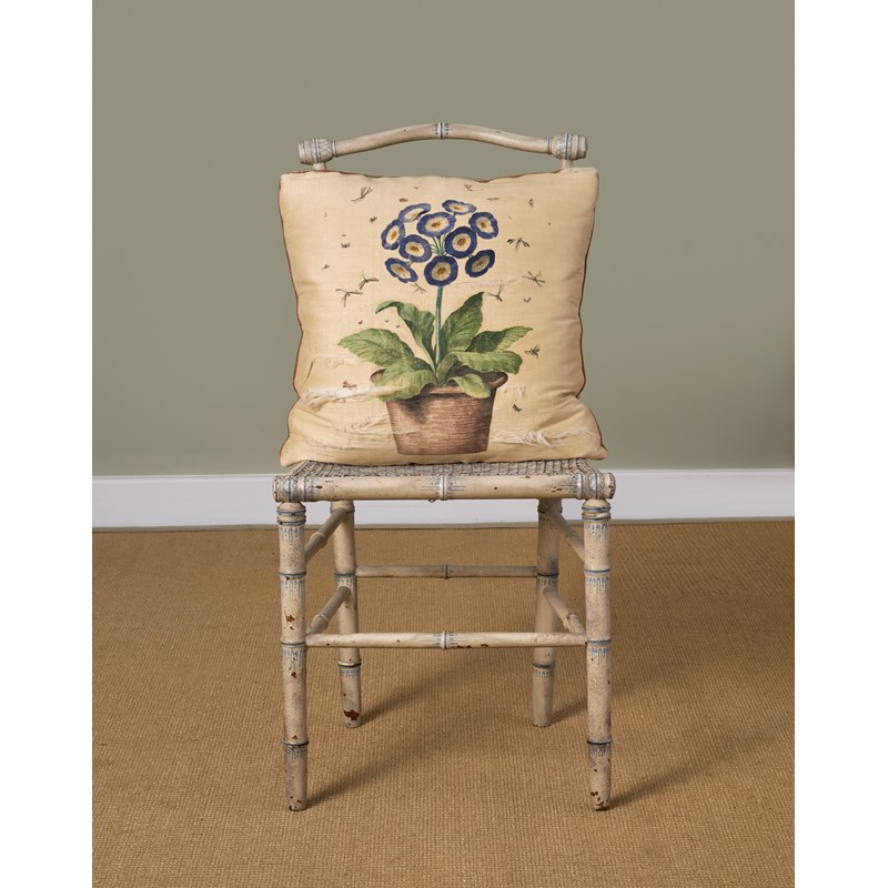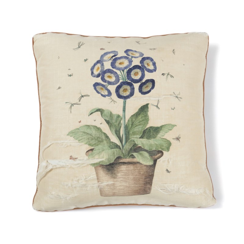 oil on silk painted with violet auriculas in a clay pot with insects, some splits