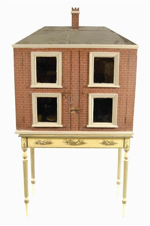 A late Victorian painted pine doll's house, the pitched roof with a single chimney stack, to a brick exterior the front with a pair of hinged doors fitted four glazed windows enclosing a four room interior, decorated with various items of furniture to include: a dressing chest with matching toilet mirror, a continental secretaire a abattant, a fire surround, a longcase clock, a brass tilt-top tripod table, a range, a rocking chair, a painted chest, a gilt decorated tea service etc, on an associated stand, 39in (99cm) h, 37.25in (94.7cm) w, 18.5in (46.6cm) d.