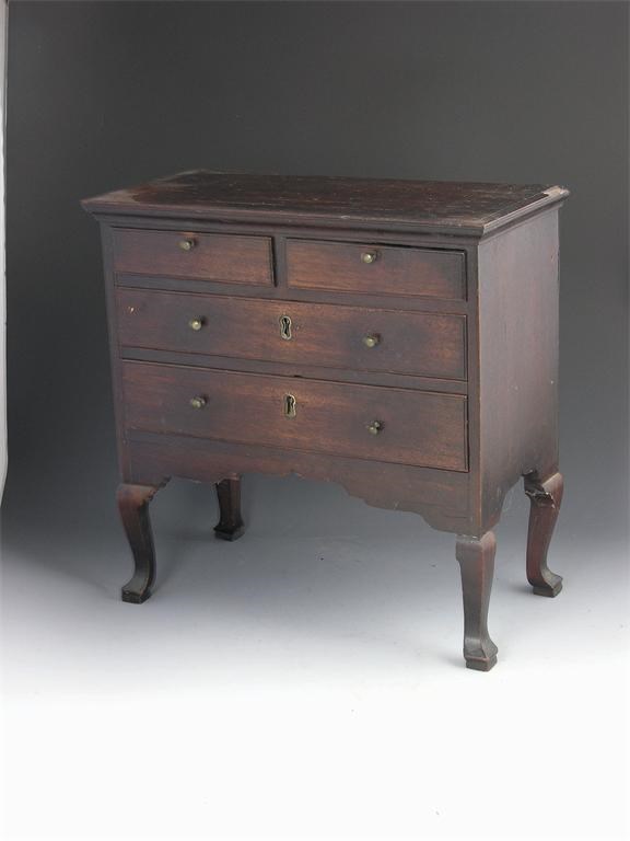 A George III mahogany miniature chest, with a moulded cornice above two short and two long drawers, with brass knob handles and shaped apron on square cabriole legs, 16in (40.5cm) h and w, 8in (20cm) d. Four brackets missing, previously with escutcheons.