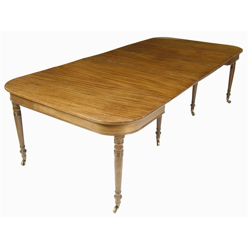 An early 19th century mahogany extending table, the 'D' shape ends with telescopic frames and three additional leaves, on ring turned legs, brass caps and castors, 28.5in (72.4cm) h, 102.25in (259.6cm) w, 48in (122cm) d. Restoration to frames, slight warping to leaves.