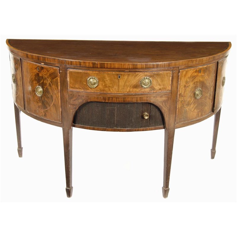 An early 19th century mahogany demi-lune sideboard, with satinwood and kingwood banding, the central frieze drawer above a tambour cupboard, flanked by two deep drawers and a pair of cupboard doors, fitted replaced octagonal brass handles, 36in (91.5cm) h, 63in (160cm) w, 27.25in (69cm) d. Both back legs spliced.