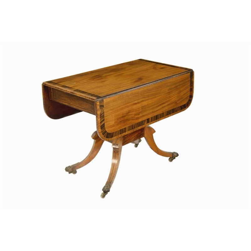 A late Regency mahogany supper table, inlaid ebonised stringing, the drop-leaf top with calamander cross banding, above two frieze drawers on scroll supports to hipped downswept legs, brass paw sabot and castors, 28.5in (72cm) h, 42 x 38in (106.4 x 96.5cm) open. Repairs and cracks to legs.