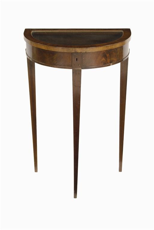 A continental mahogany demi-lune bijouterie table, on square tapering legs, 30.75in (78cm) h, 20in (50.5cm) w, 12.5in (31.6cm) d. One leg repaired.
