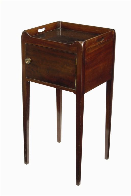 A late George III mahogany pot cupboard, with pierced handgrips on square tapering legs, 32.75in (83cm) h, 15.5in (39.3cm) w, 14.5in (36.7cm) d.