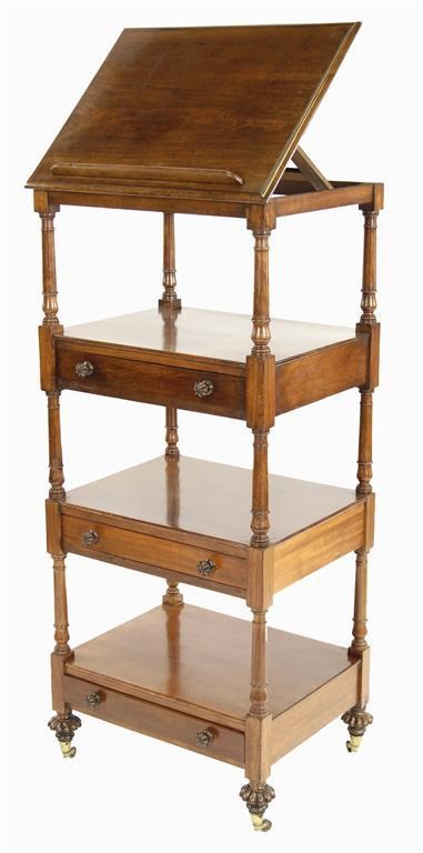 A William IV mahogany four tier whatnot, the hinged and ratcheted top fitted a rest, above three drawers, with turned column supports, on lobed bun feet, brass caps and castors, 52.25in (132.6cm) h, 25.5in (59.5cm) w, 17.75in (45cm) d.