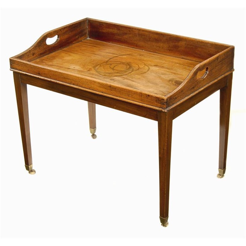 An early 19th century mahogany butler's tray, with pierced side handgrips and on a later stand, 23.75in (60.5cm) h, 30in (76.5cm) w, 19.5in (49.5cm) d.