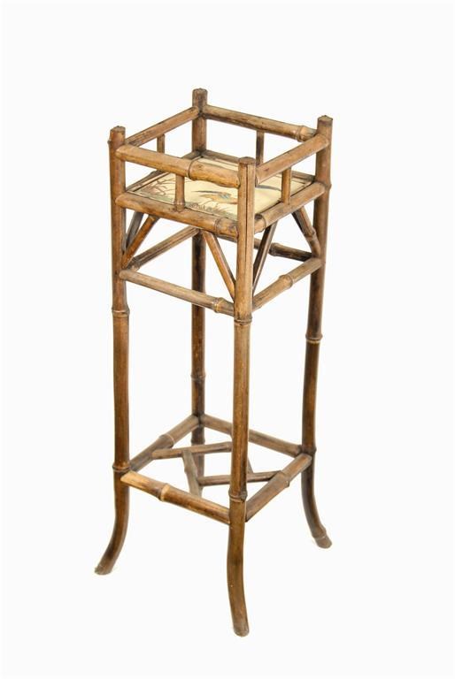 A late Victorian bamboo stand, inset a pottery tile decorated with birds, 32.5in (82.7cm) h, 12.25in (31cm) w and d.