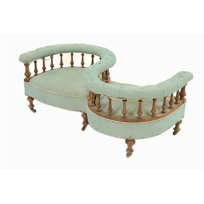 A Victorian walnut conversational settee, with turned baluster spiral supports, 56in (142cm) l.