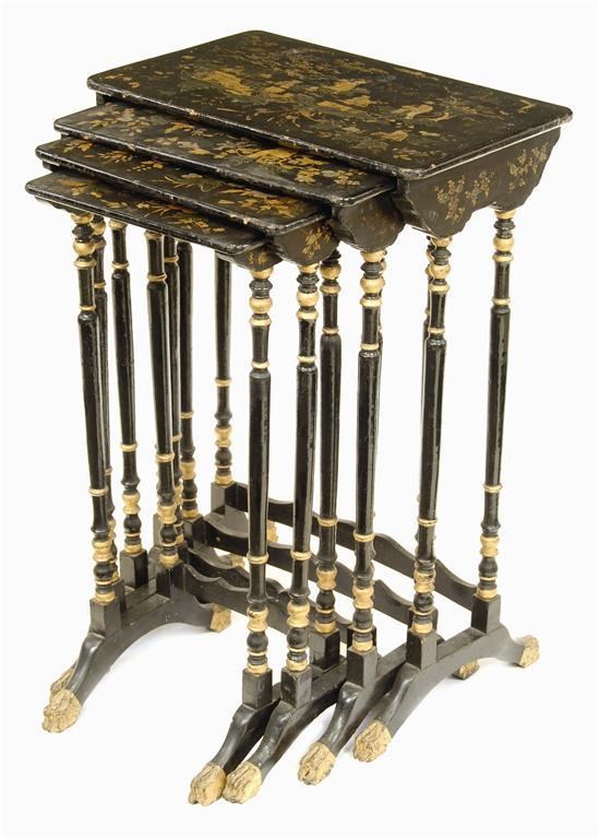 A quartetto nest of four black lacquer occasional tables, decorated with gilt chinoiseries, c.1900, 29in (73.6cm) h, 19.25in (48.8cm) w, 12.5in (31.6cm) d, max. Decoration worn, chips to feet.