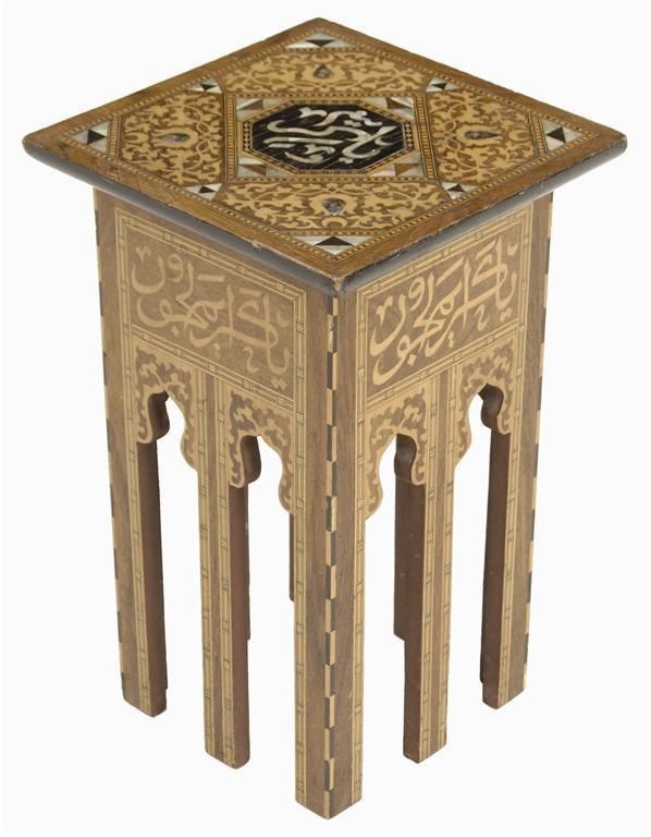 A Moorish marquetry occasional table, inlaid mother of pearl and abalone, 17.75in (44.9cm) h, 11in (28.3cm) w and d.