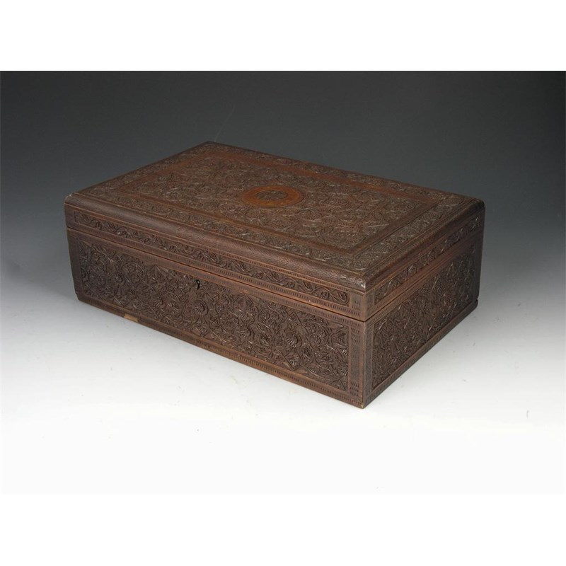 An Anglo-Indian carved walnut box, the hinged cover with monogram 'I R' to a triple divided interior, 5in (13cm) h, 14in (35.5cm) w, 9in (23cm) d.