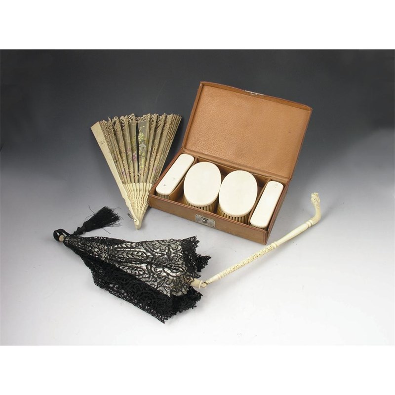 A set of ivory backed brushes, a pair of oval backed and a pair of rectangular and together with an ivory handled button hook, contained in a leather travel case, initialled 'H.R.F', 10.75in (27.5cm) h, a parasol with a Chinese carved ivory dragon handle with an articulated tongue and a European fan with ivory sticks. (3)