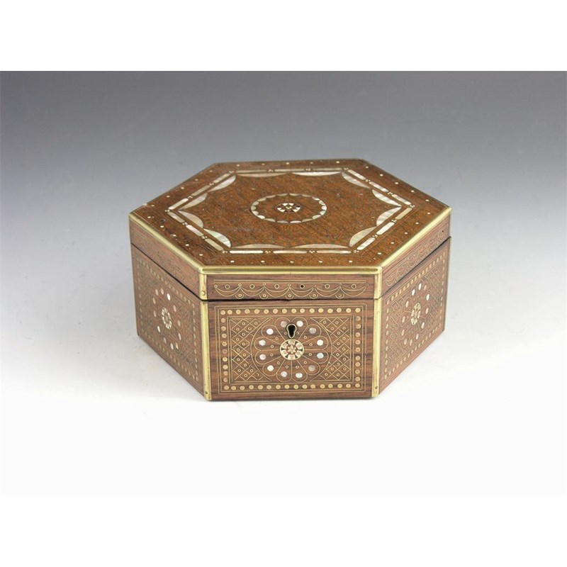 A rosewood, brass and mother of pearl inlaid octagonal box, with a burr veneered and plush lined interior, 3.25in (8cm) h, 7.25in (18.5cm) w.