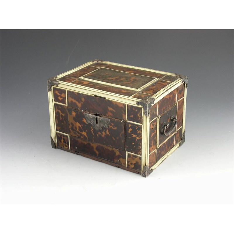 An Indo-Portugese tortoiseshell and ivory small table cabinet, with silver coloured metal corner mounts, escutcheon and side handles, with a hinged fall revealing an arrangement of six drawers, the central deep drawer with a secret drawer behind, 18th century, 5.5in (14cm) h, 8.25in (21cm) w, 6.25in (16cm) d. General wear, minor losses to ivory, 5 pieces present, repair to base where the hinges meet.