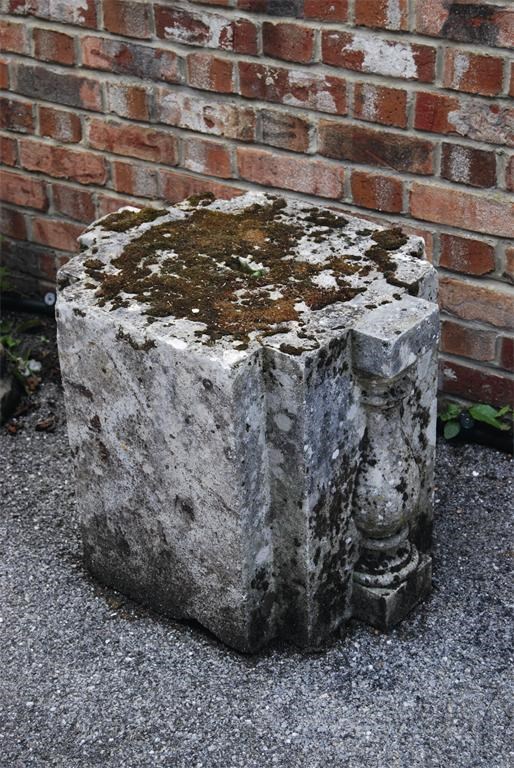 A reconstituted stone plinth, with breakfront sides having baluster pilasters,19in (48.5cm) h, 22.5in (57cm) w, 17.75in (45cm) d, with a similar base and top. (3)