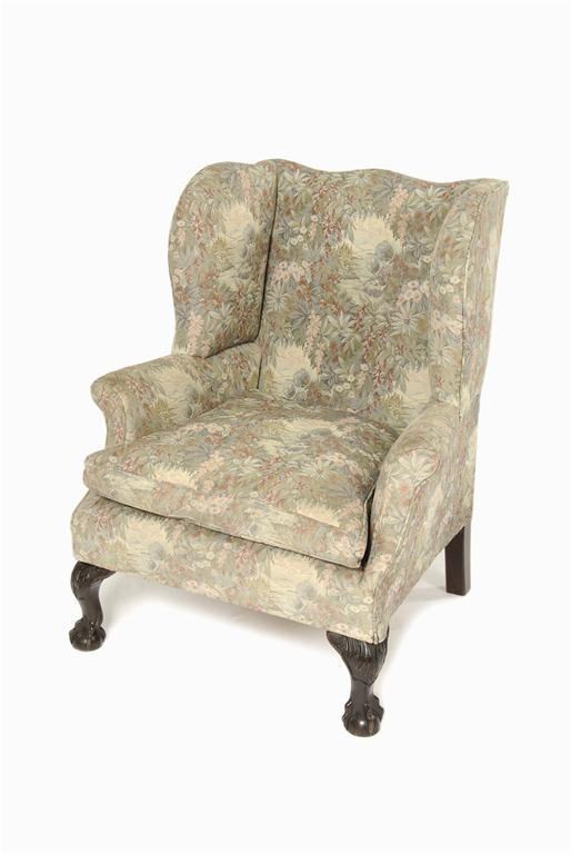 A mahogany wing armchair, in George III style, on leaf carved cabriole front legs and claw and ball feet, early 20th century.