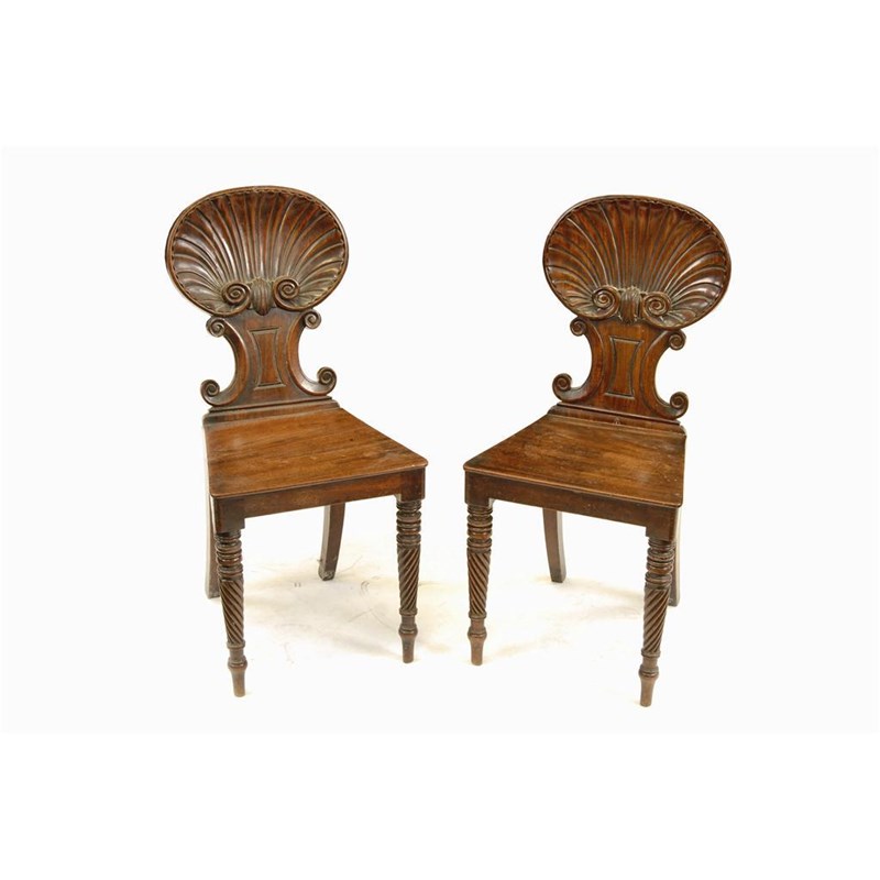 A pair of late Regency mahogany hall chairs in the manner of Gillows, with carved shell backs on waisted scroll supports, the tapering seat on ring turned and spiral ribbed legs. (2) One with damages.