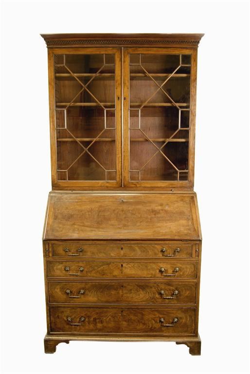 A George III mahogany bureau bookcase, the Greek key moulded cornice above a pair of astragal glazed doors with barber's pole stringing enclosing adjustable shelves above a pull-out slide, the feather strung base with a hinged fall enclosing drawers and pigeon holes above graduated drawers, the veneered fronts with marquetry inlaid husks emanating from the escutcheon, with brass handles (probably replaced), on shaped bracket feet, 85.5in (217cm) h, 43in (109.3cm) w, 21in (53.5cm) d.