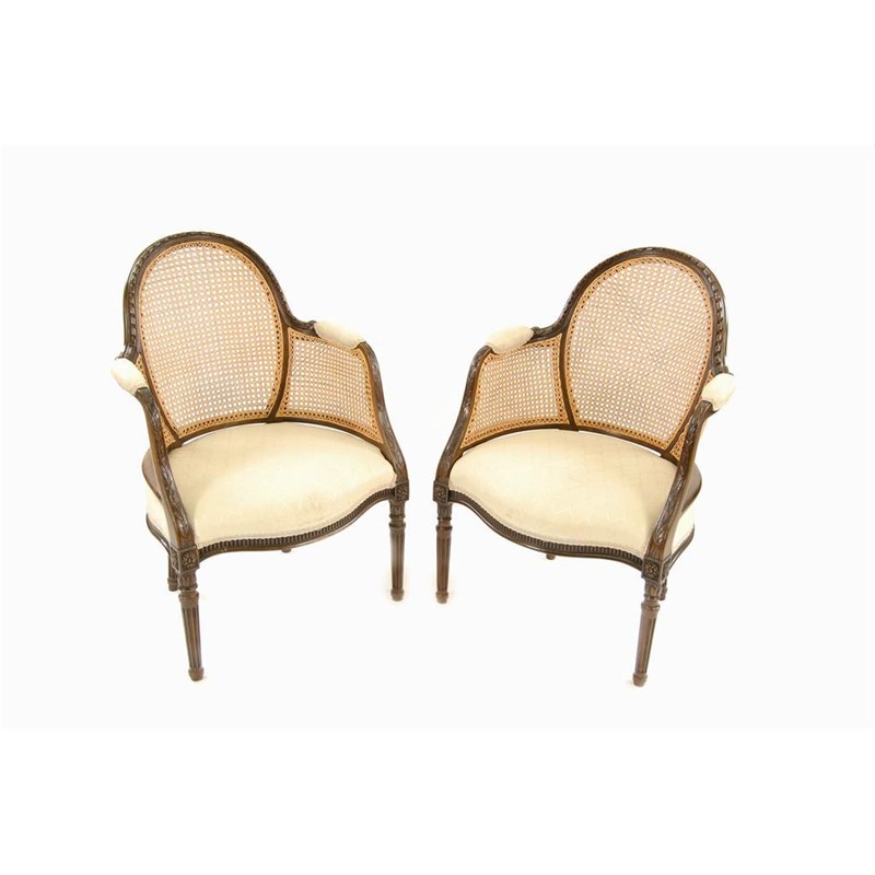 A pair of carved mahogany bergeres, with cane backs and arms, with a cable border and trailing foliate supports to a serpentine front seat on petal carved and turned fluted legs. (2)