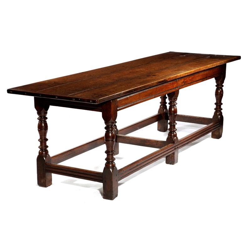 the boarded top with cleated ends, above a moulded frieze on six ring turned legs united by moulded peripheral stretchers