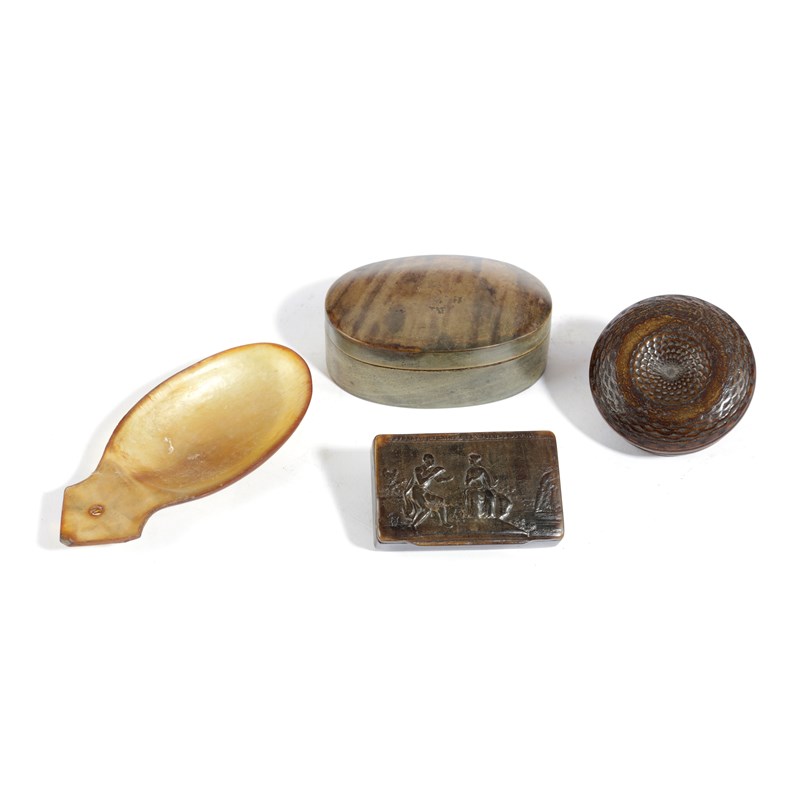 one with engine turned decoration to the lid, one of oval form with a tortoiseshell lid, the other a French example, the lid pressed with a classical scene, depicting Petrarch at the fountain of Vaucluse, together with a horn spoon (4)