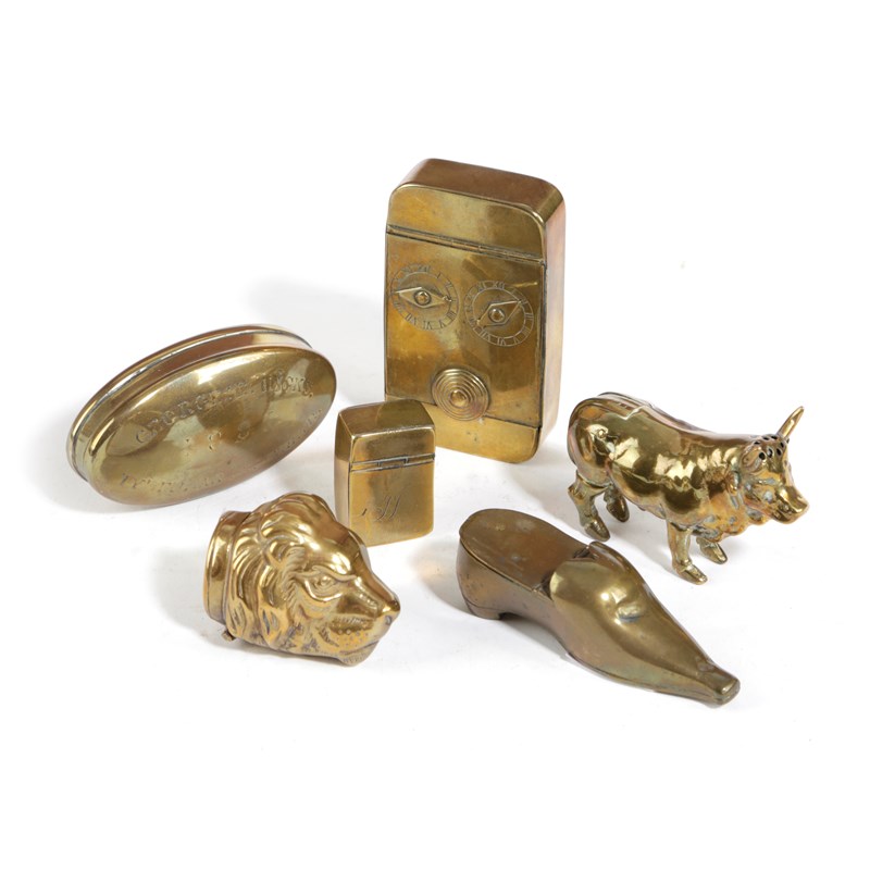 including: a combination snuff box with two dials, a Welsh miner's snuff box, dated '1885' and inscribed 'George E. Hicks, Tydfil Arms Merthyr', a snuff shoe and two vesta cases one in the form of a bull the other a lion's head (6)