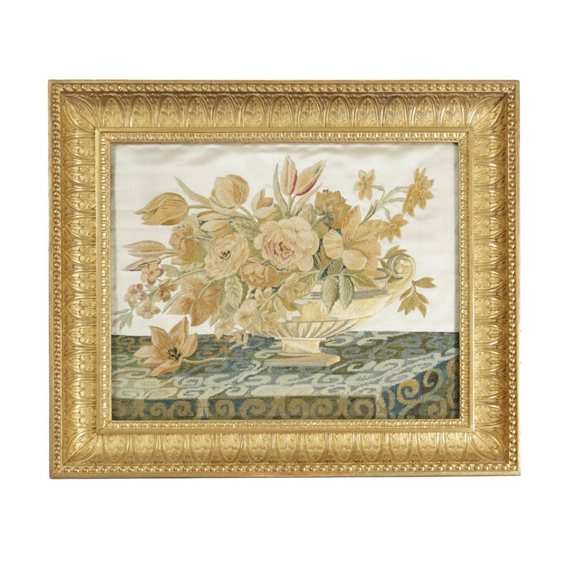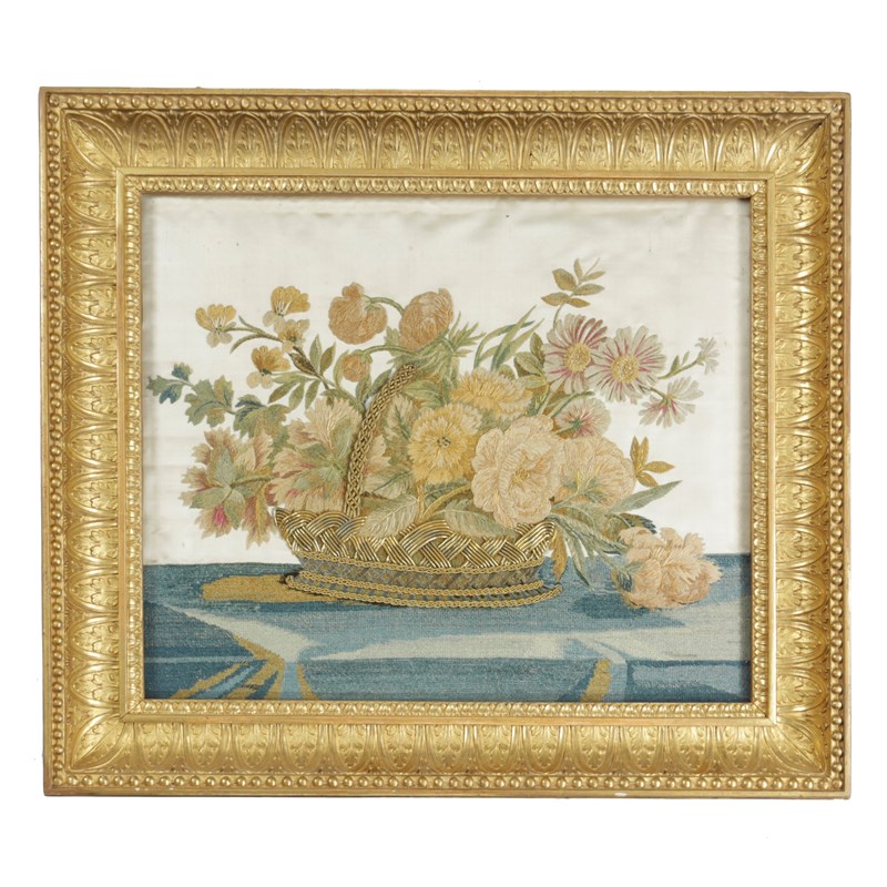 worked in silk, gilt and silver threads depicting a basket and vase of flowers on table cloths in gros and petit point, in gilt gesso frames (2)