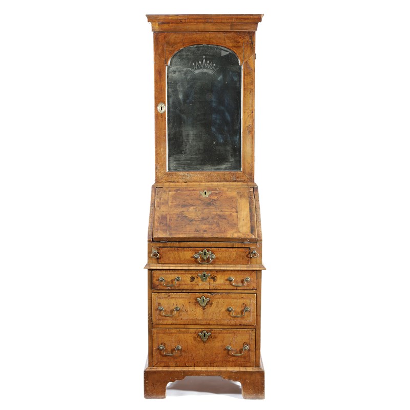 with cross and feather banding, the upper section with a bevelled mirror door, etched with a crown revealing three adjustable shelves, above a fitted interior with pigeon holes, drawers and a central curved cupboard, above four long drawers