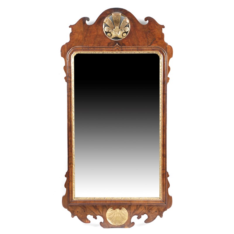 A GEORGE II WALNUT FRET-FRAME WALL MIRROR