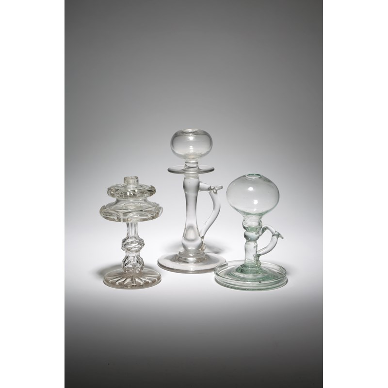 two with loop handles and circular feet, the third with cut decoration but lacking its reservoir (3)
