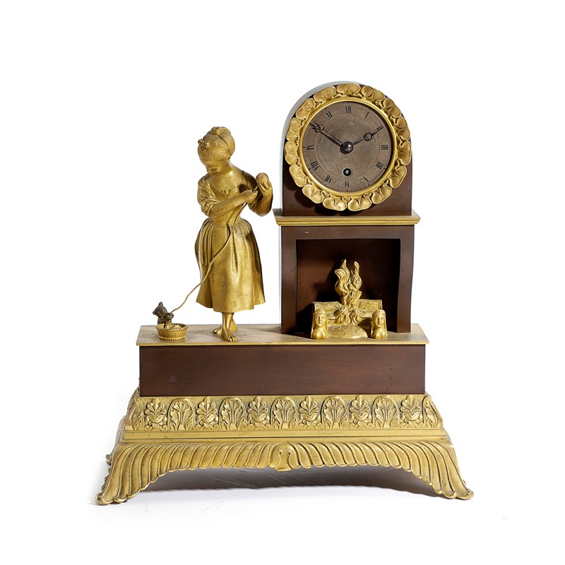 the brass eight day drum movement stamped '118' with a circular silvered dial with Roman numerals and engine turned guilloche centre, the case modelled as a fireplace with logs burning on sphinx fire dogs, a girl standing to one side playing with balls of wool and a kitten on a rectangular base cast with a band of stiff leaves and foliate base