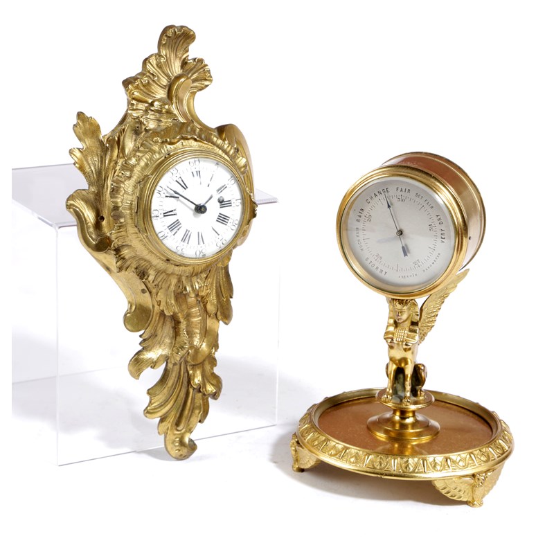 the brass pocket watch style movement indistinctly inscribed, with an enamelled dial with black Roman hour and Arabic five minute numerals in a Rococo style scrolling case, together with a brass Egyptian revival aneroid desk barometer with a silvered dial, on a winged sphinx support and circular tray base with owl feet (2)
