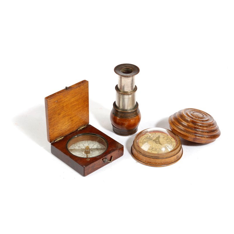 with a printed dial, together with a George IV treen beehive pocket sundial and compass, the underside of the lid with a printed paper label 'Porter's Magnetic Sundial on the Floating Compass Card, Sam Porter Fecit Feby 16th 1824' and a coquilla nut and copper monocular (3)
