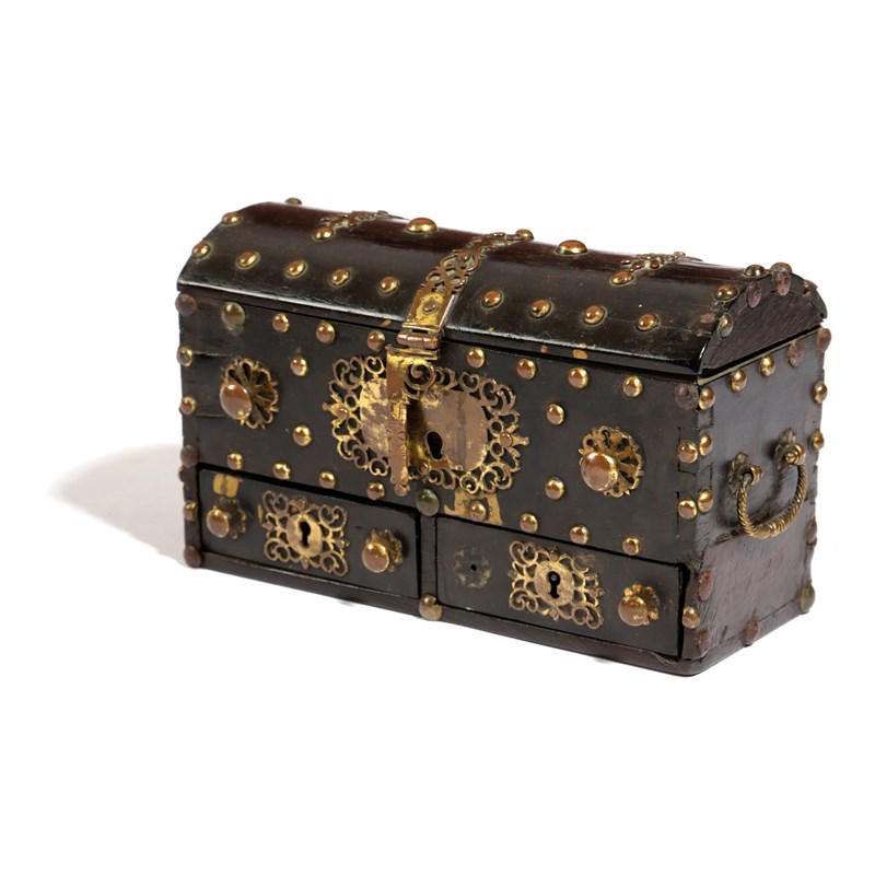 of domed form, the hinged cover enclosing a vacant interior, above a pair of short drawers, applied with fret cut hinges, escutcheons and handles, with rope twist carrying handles