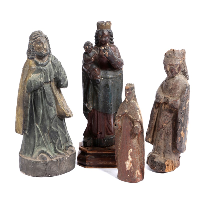 including a Madonna and Child, a figure of a man, possibly Christ, and two further saints, all with remains of painted decoration (4)