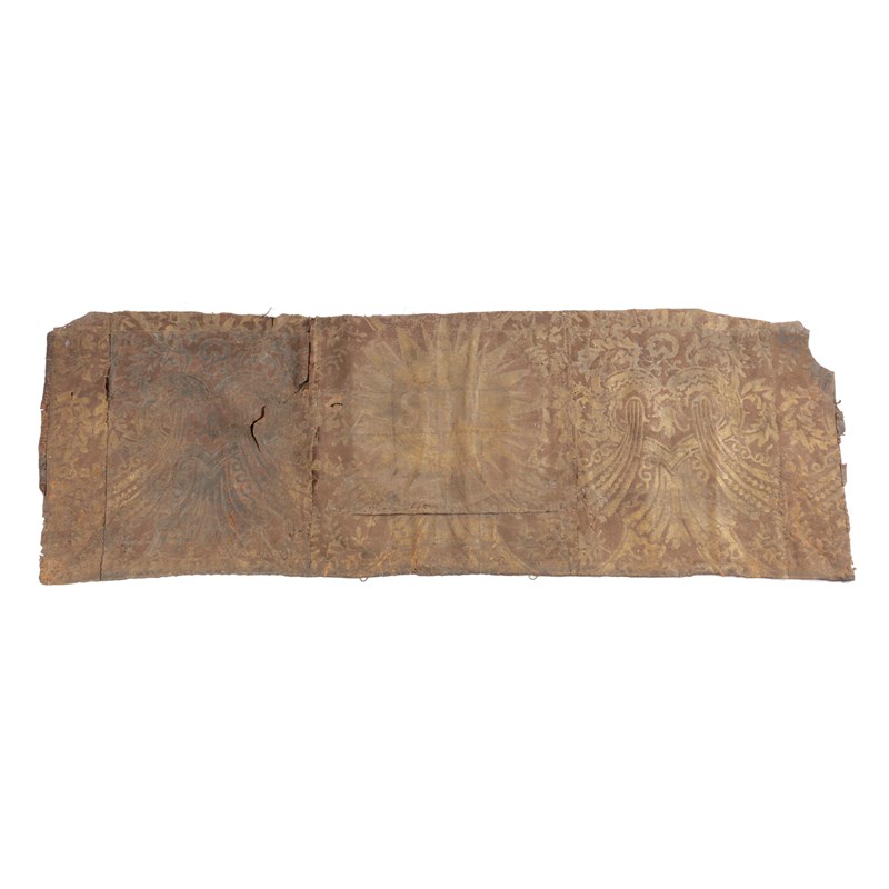 painted and gilded with a central sunburst surrounded by stylised foliage, arabesques and arcading, with losses and repairs