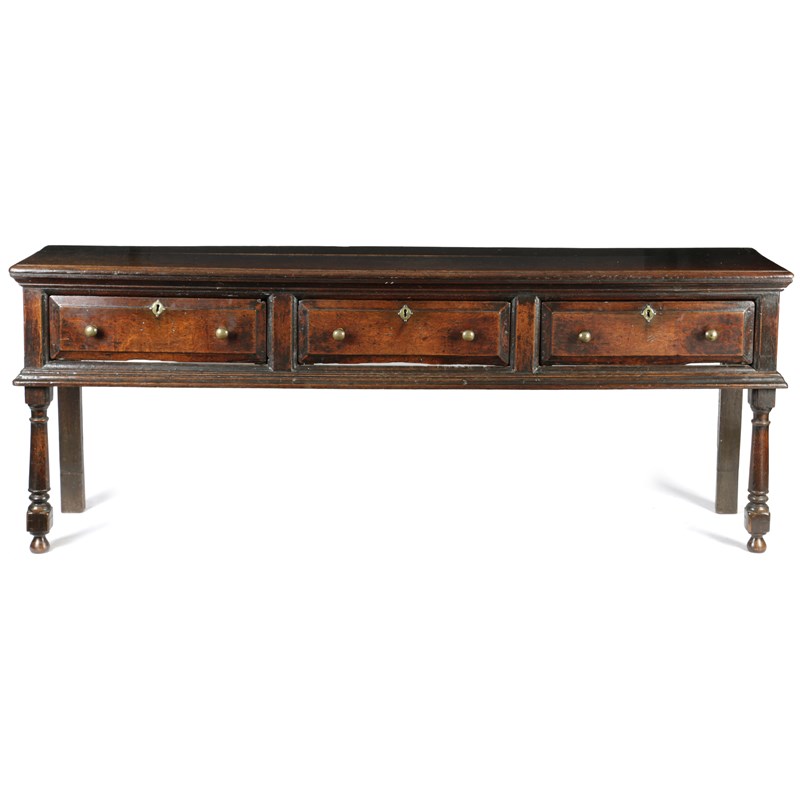 the boarded top above three fielded frieze drawers on turned and block front legs