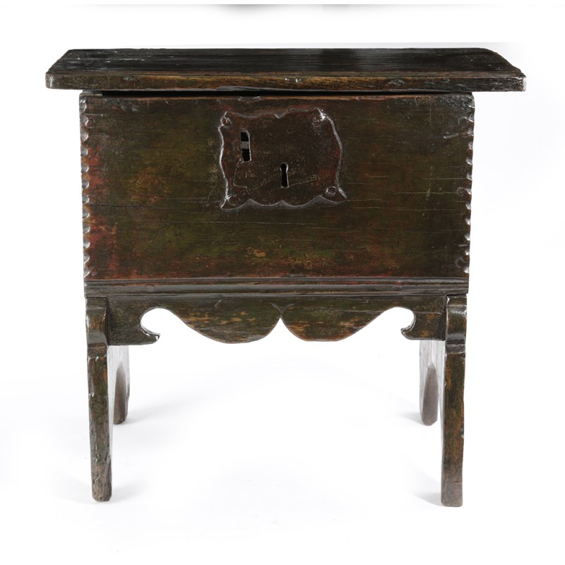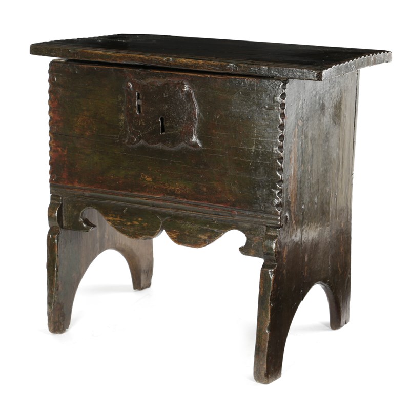 with traces of polychrome decoration, the hinged lid with a moulded front and gouge carved sides above an archers bow apron and cut-out ends