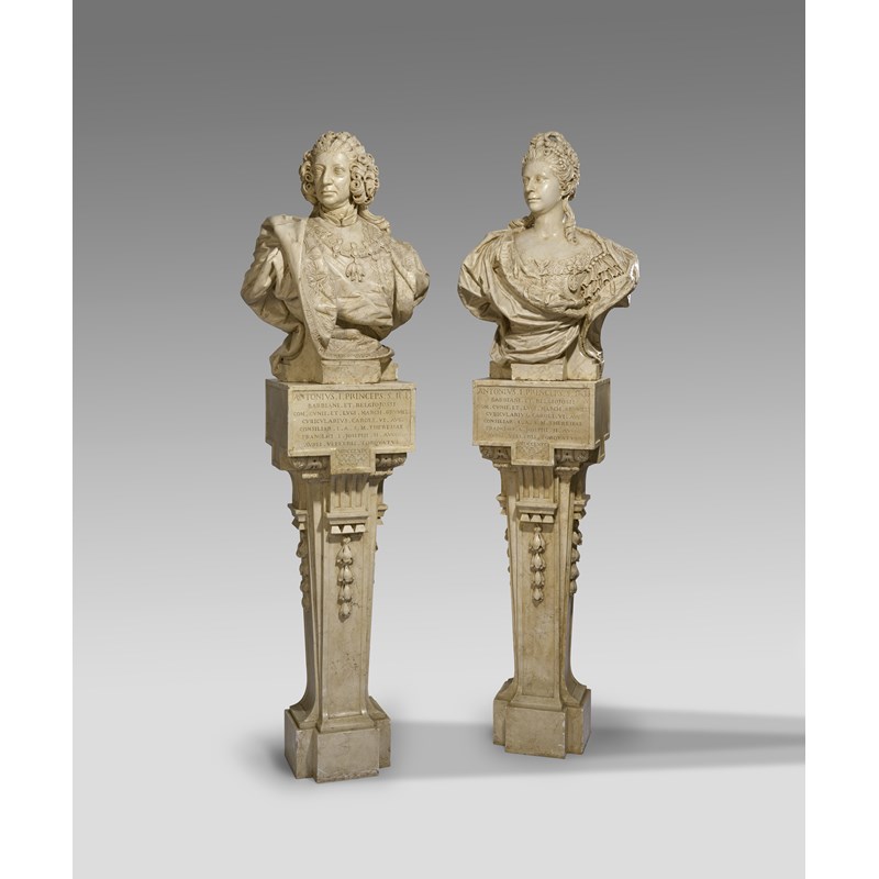 depicting Antonio and his wife Barbara Luigia Elisabetta d'Adda each on a term pedestal inscribed in Latin 'Antonius.I.Princeps.S.R.I.Barbiani.Et.Belgiojosii....' (4)