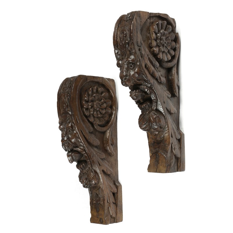 A PAIR OF CARVED OAK LION'S MASK CORBELS