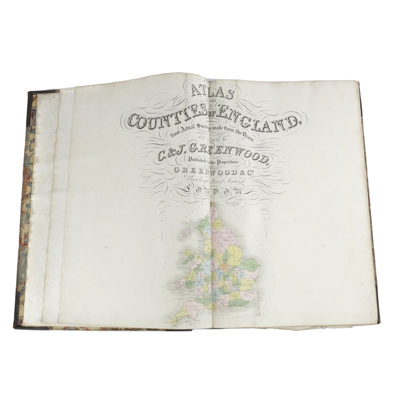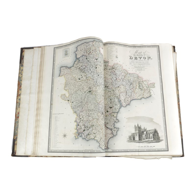 from actual surveys made from the years '1817-1833', with a double-page calligraphic title with a hand-coloured map of England & Wales and forty-six engraved maps with contemporary hand-colouring, each with an ecclesiastical or castle vignette, table of explanation, compass rose and calligraphic title, with original marbled end papers, half morocco bound boards with a gilt title to the spine