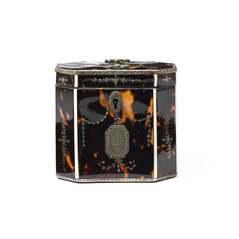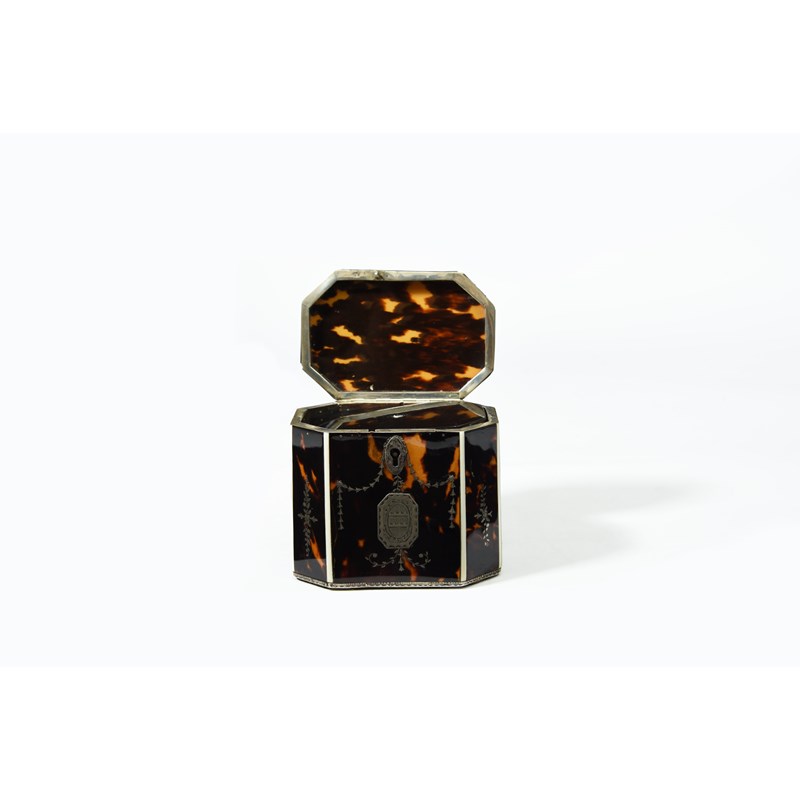 λ A GEORGE III TORTOISESHELL AND SILVER TEA CADDY