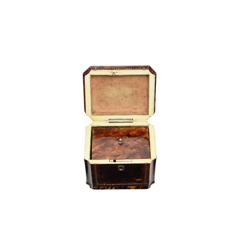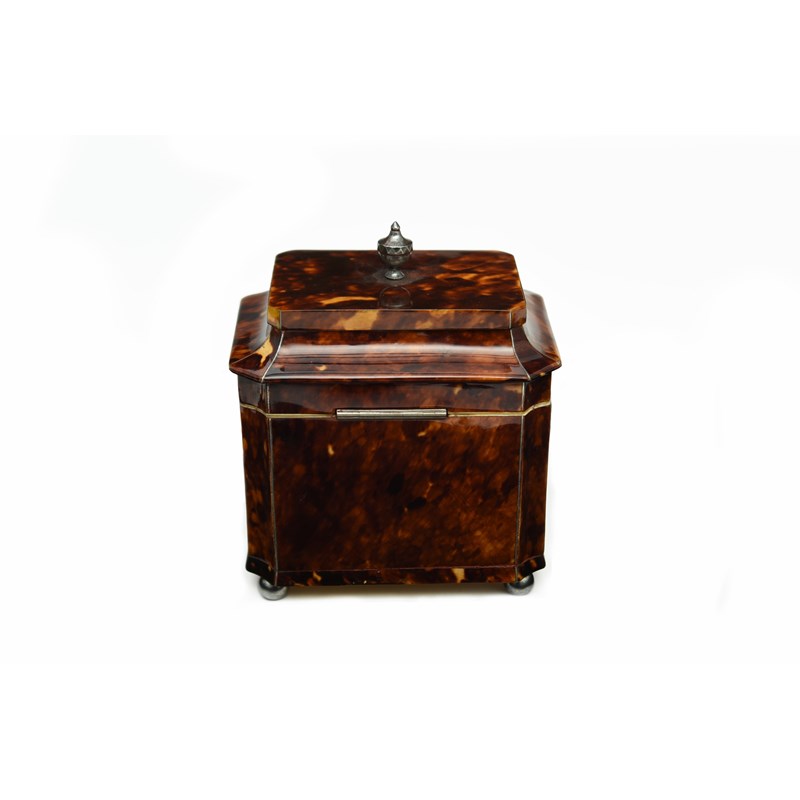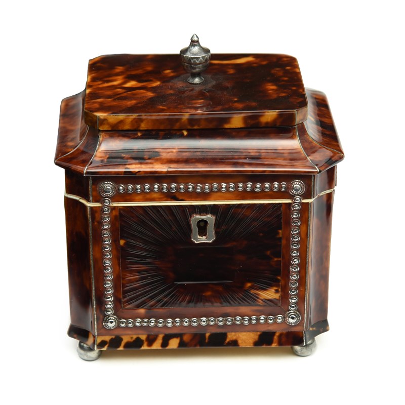λ A LATE REGENCY TORTOISESHELL AND BRIGHT-CUT STEEL STUDDED TEA CADDY