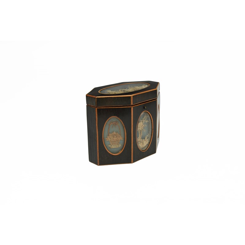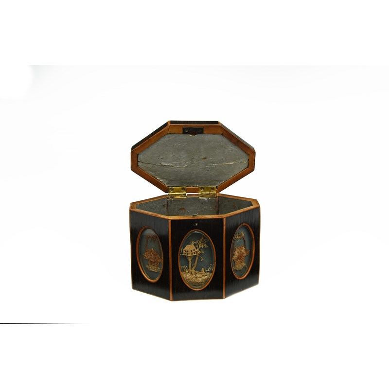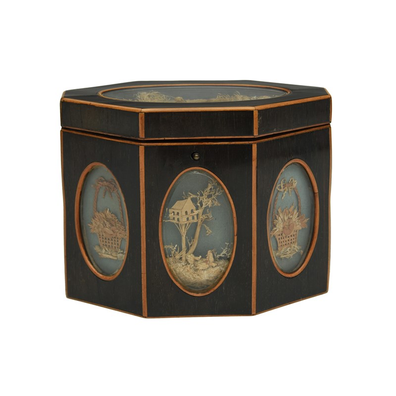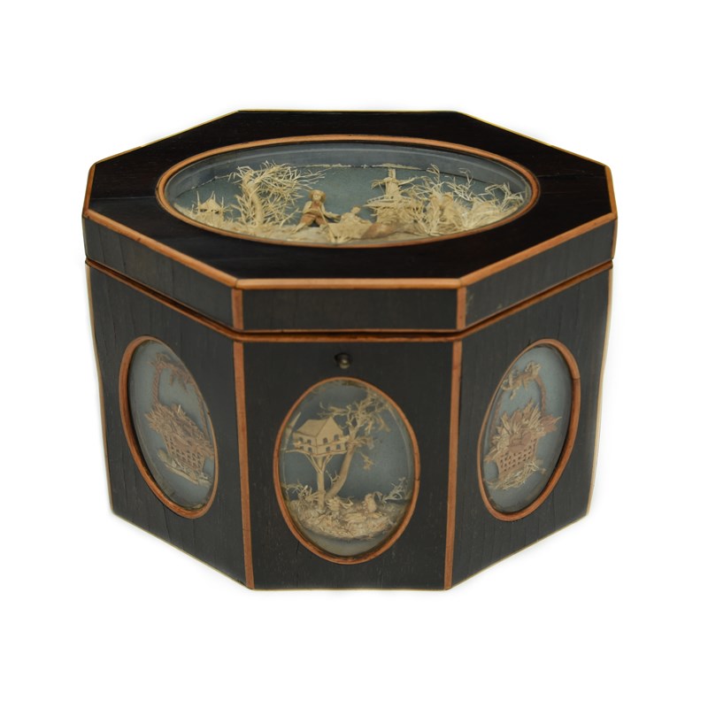 of octagonal form, the cover and sides inset with modelled paper cameos depicting trophies and rustic scenes, under glass, the reverse with bat's wing paterae