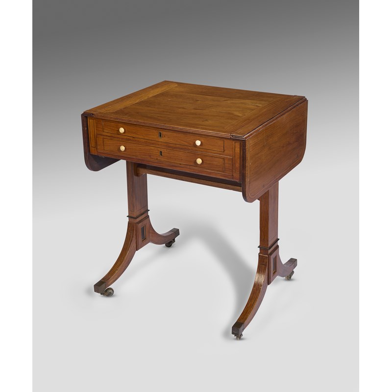 inlaid with stringing and banding, the drop-leaf top with a reeded edge, with a sliding reversible centre inlaid with an ebony and boxwood chequer board to the underside, revealing a backgammon board, inlaid with ebony and bone, with parquetry squares and lozenges, above a camphorwood double sided frieze drawer, with bone handles, on trestle ends and swept legs, terminating in brass castors