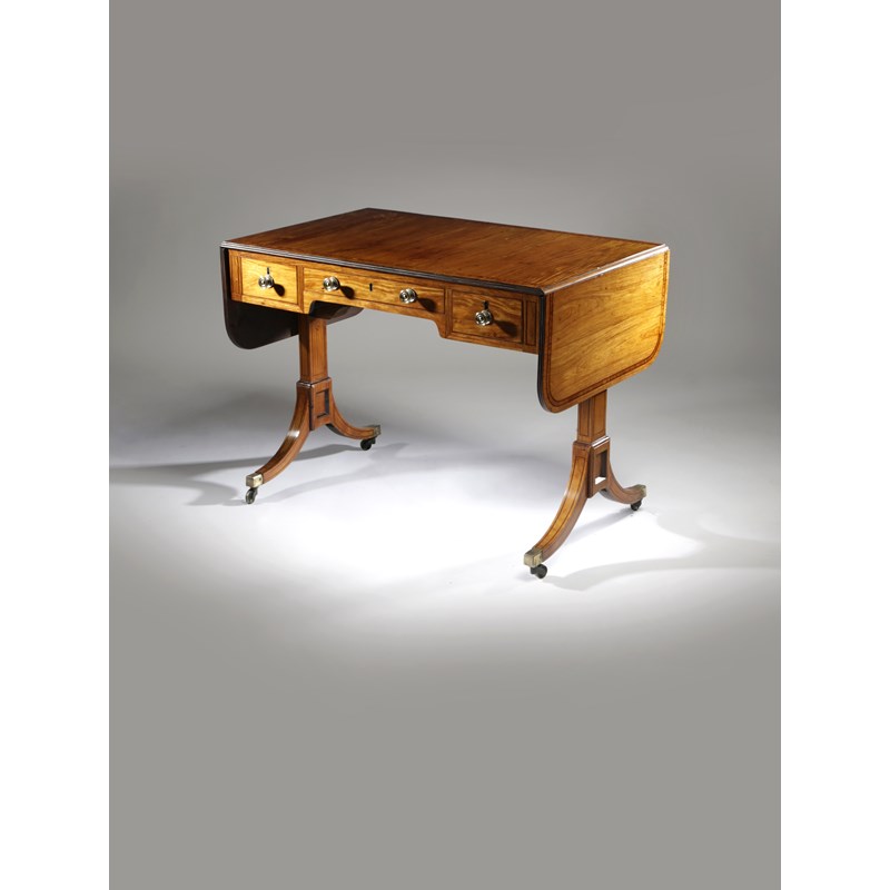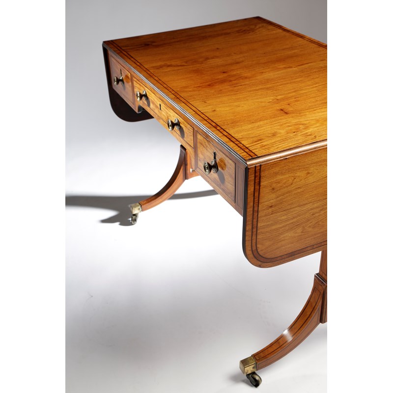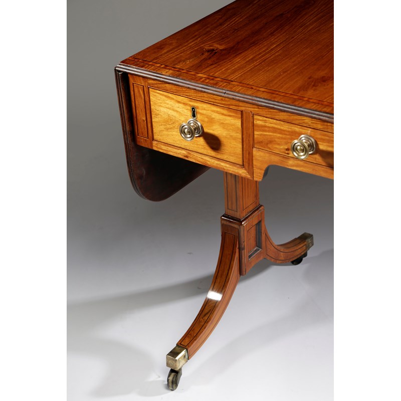 inlaid with stringing and satinwood banding, the drop-leaf top with a reeded edge above three frieze camphorwood lined drawers and a shaped apron on panelled trestle ends terminating in brass caps and castors