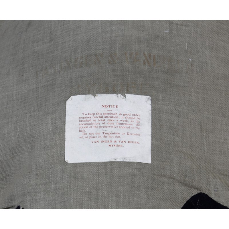 the full head mount in a snarling pose with glass eyes, with a khaki canvas back and black felt edging, stencilled '190 51' and 'VAN INGEN & VAN INGEN' with a printed notice sticker