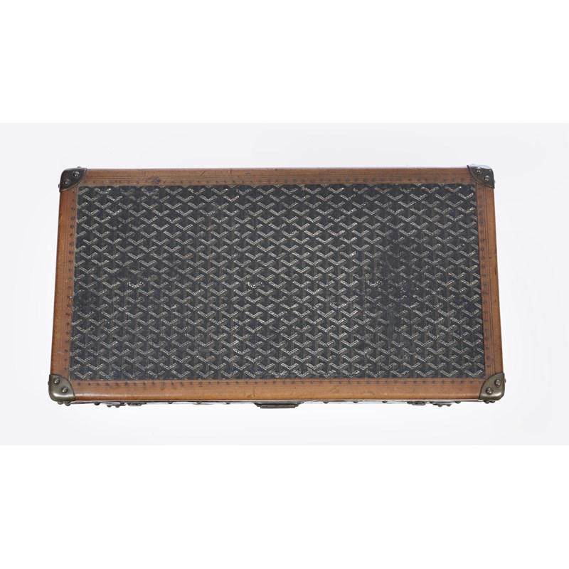 leather bound with brass mounts and fittings, with Goyardine chevron canvas, signed 'E.Goyard', the left side with a brass plaque inscribed 'Malles Goyard 233 Rue St. Honare, Paris, Monte Carlo, Biarritz', the interior fitte with two lift-out felt lined trays, each with five divisions and leather handles stamped 'Goyard', possibly for shoes